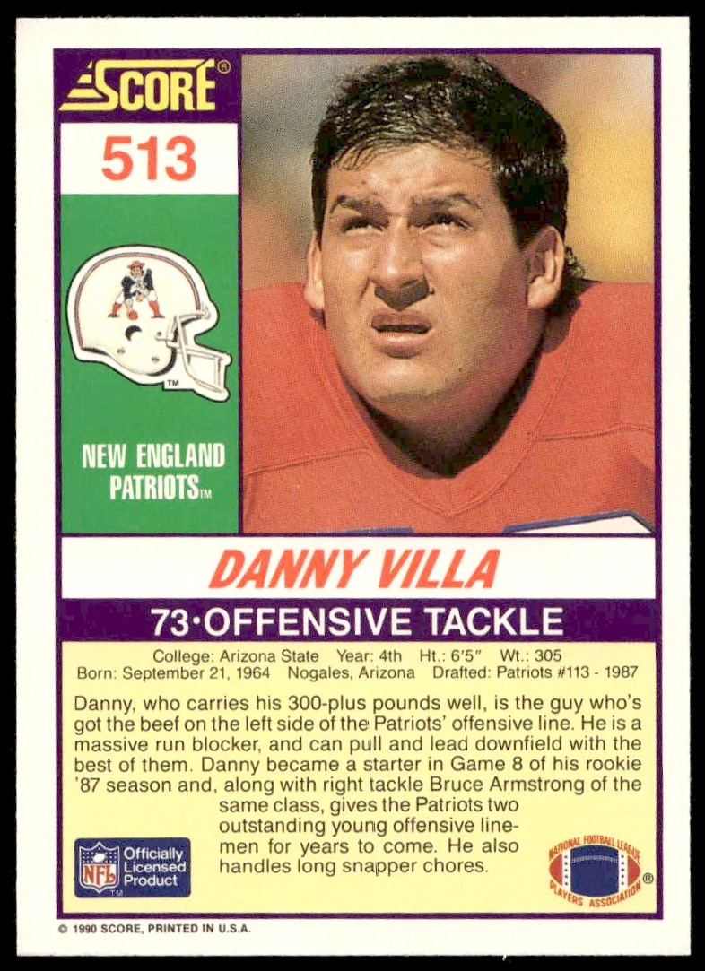 This Football card, from 1990 is part of the Score card set. Danny Villa is featured and has a card number of 513.