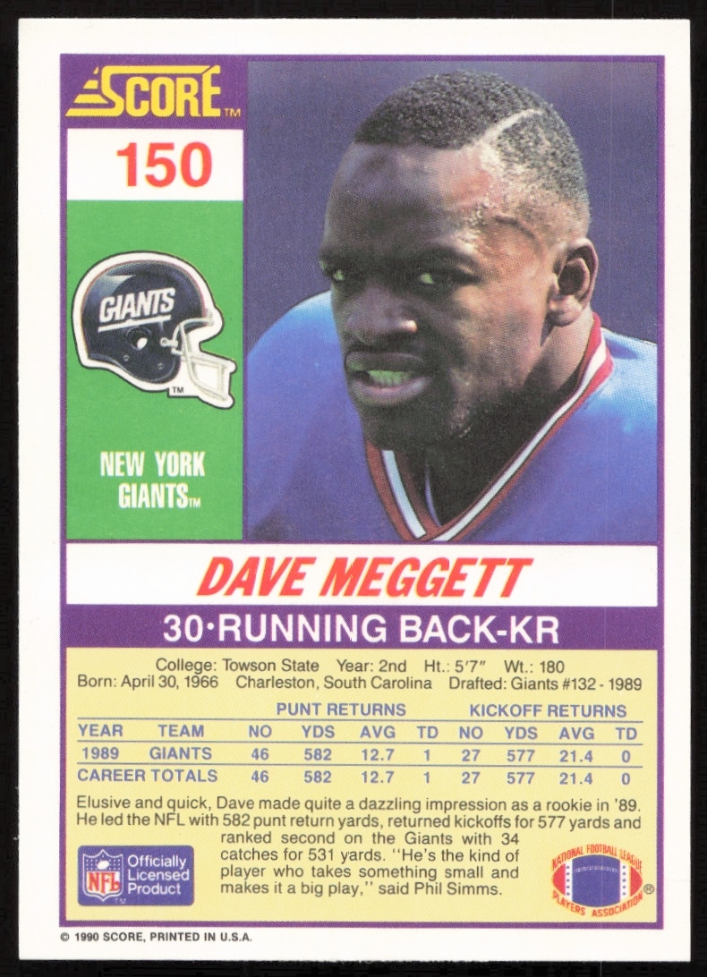 This Football card, from 1990 is part of the Score card set. Dave Meggett is featured and has a card number of 150.
