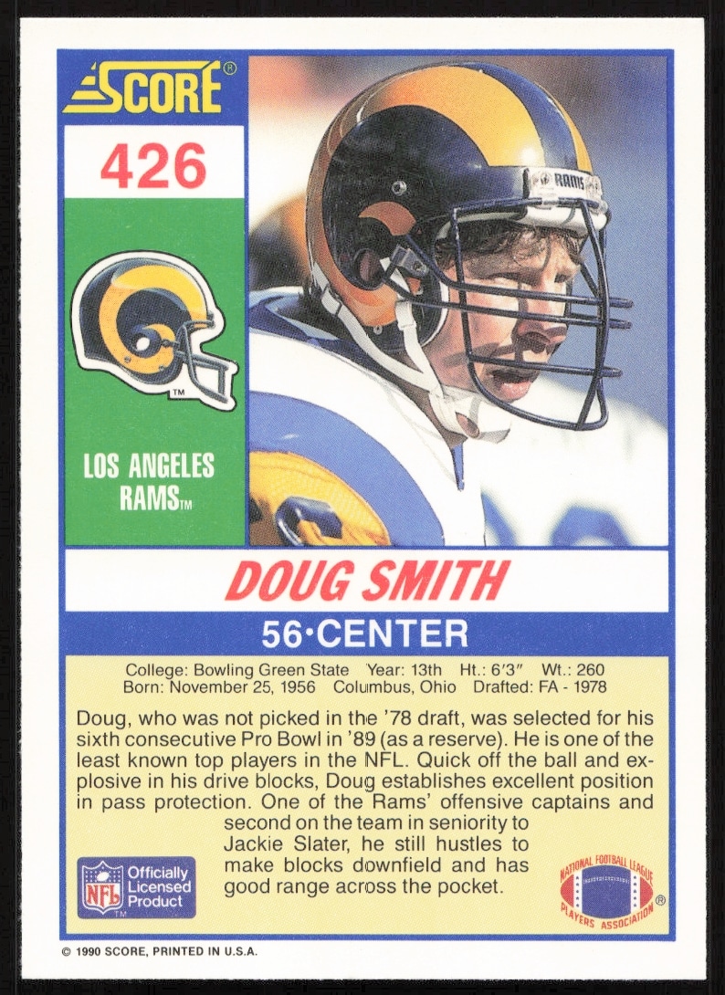 This Football card, from 1990 is part of the Score card set. Doug Smith is featured and has a card number of 426.