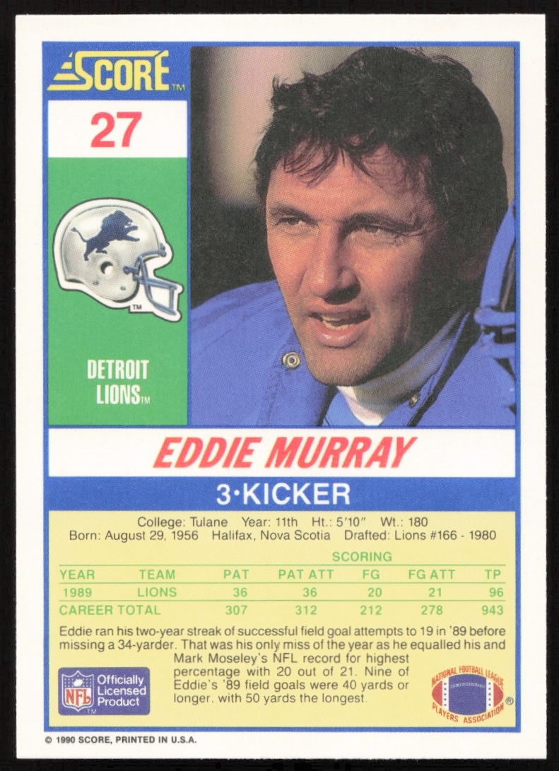This Football card, from 1990 is part of the Score card set. Eddie Murray is featured and has a card number of 27.