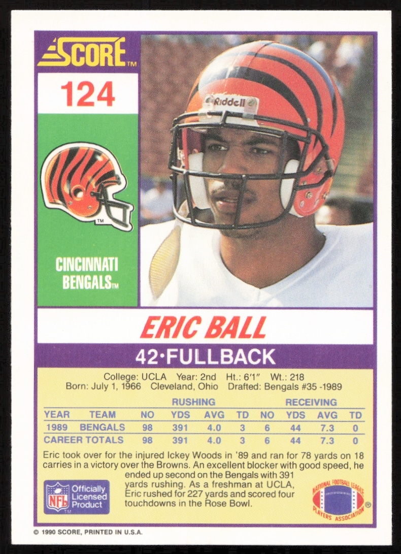 This Football card, from 1990 is part of the Score card set. Eric Ball is featured and has a card number of 124.
