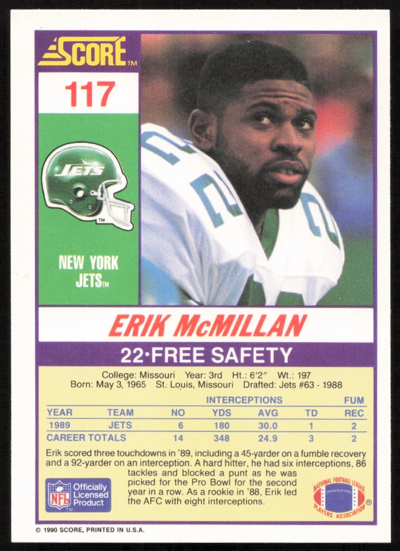 This Football card, from 1990 is part of the Score card set. Erik McMillan is featured and has a card number of 117.