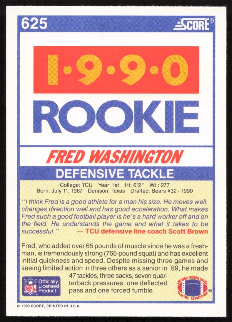 This Football card, from 1990 is part of the Score card set. Fred Washington is featured and has a card number of 625.