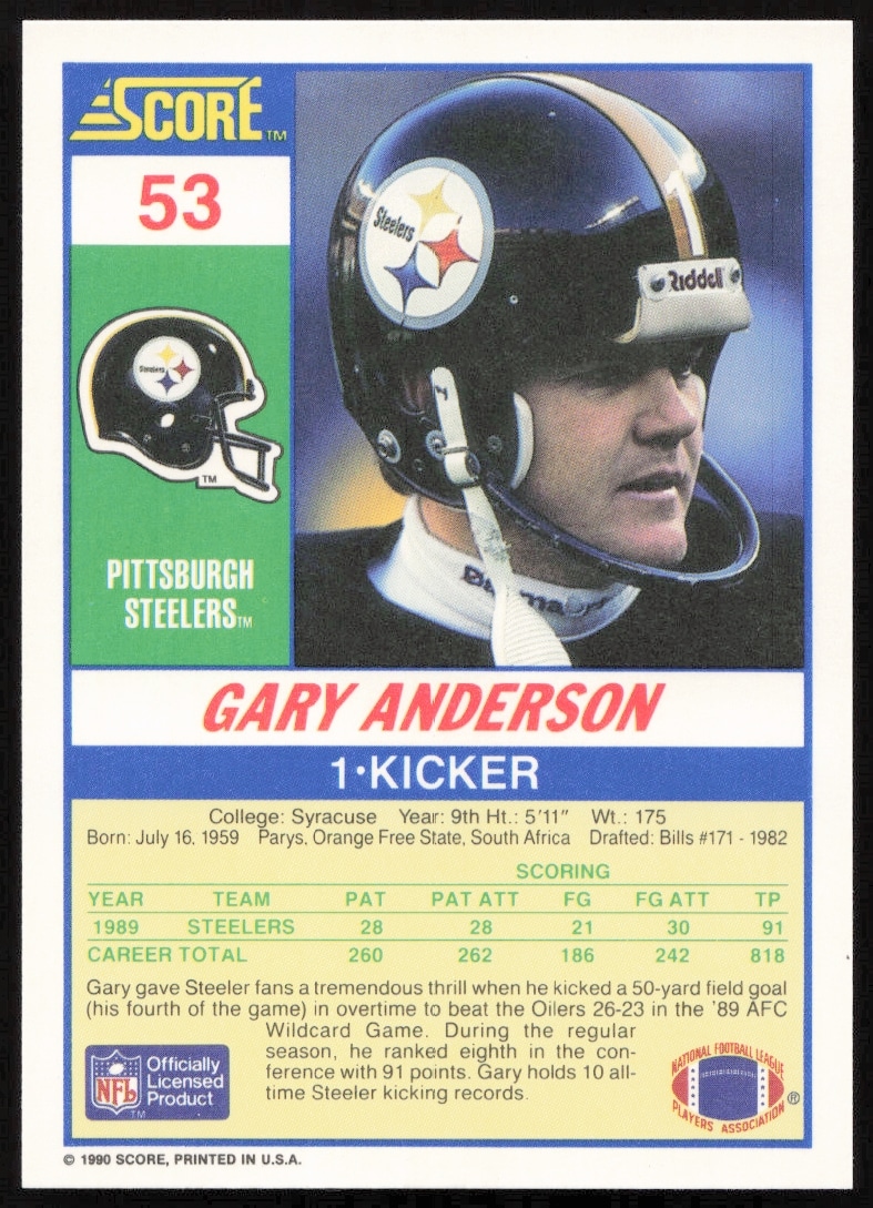 This Football card, from 1990 is part of the Score card set. Gary Anderson is featured and has a card number of 53.