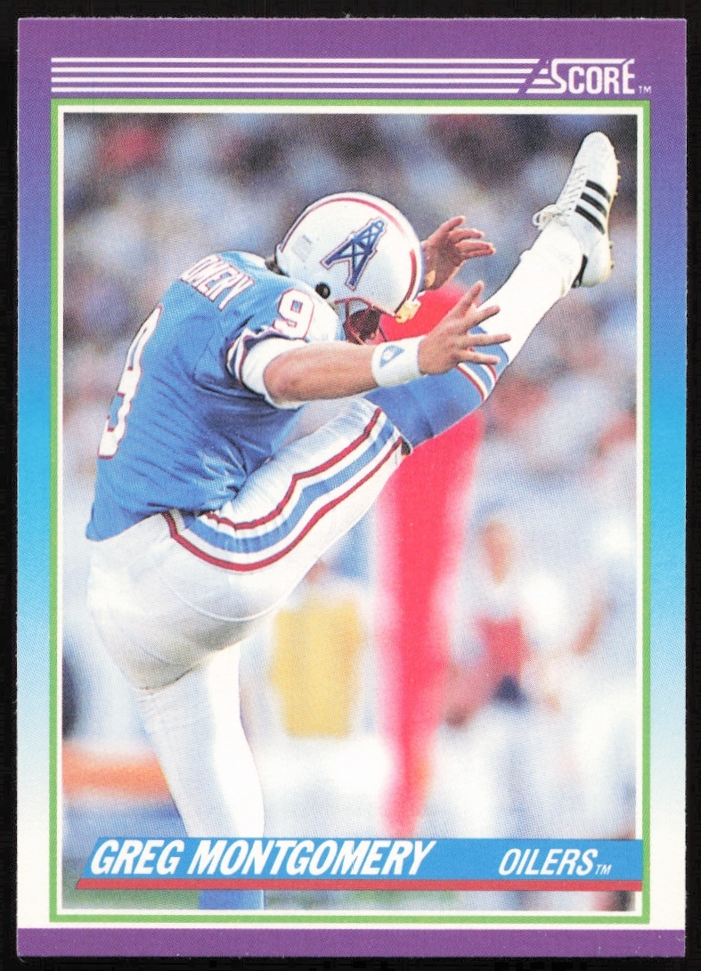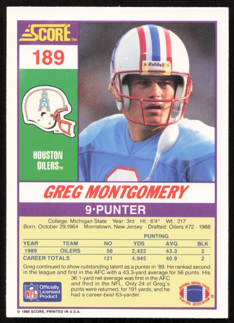 This Football card, from 1990 is part of the Score card set. Greg Montgomery is featured and has a card number of 189.