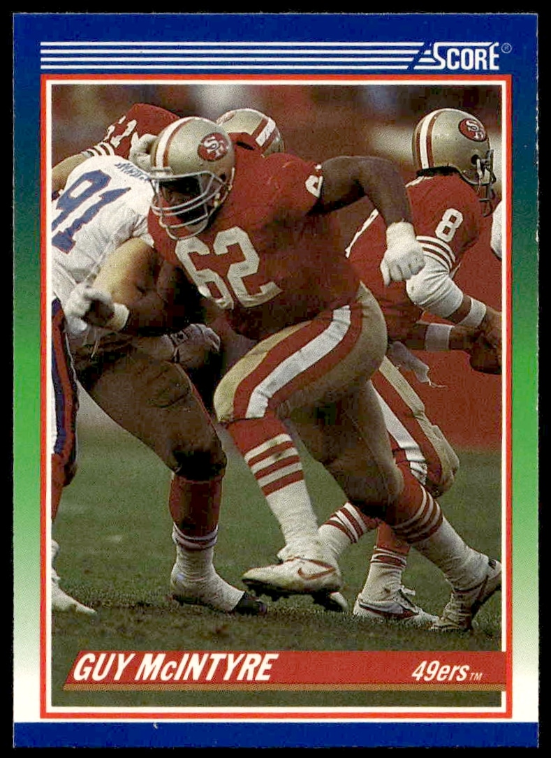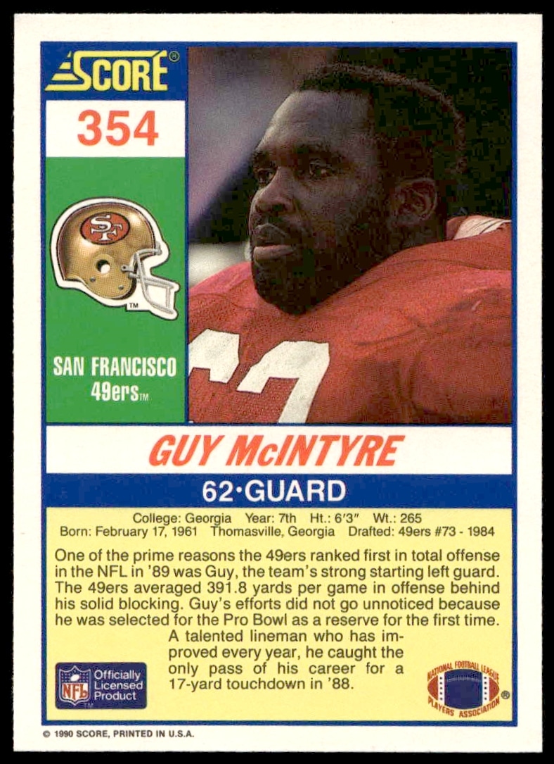 This Football card, from 1990 is part of the Score card set. Guy McIntyre is featured and has a card number of 354.