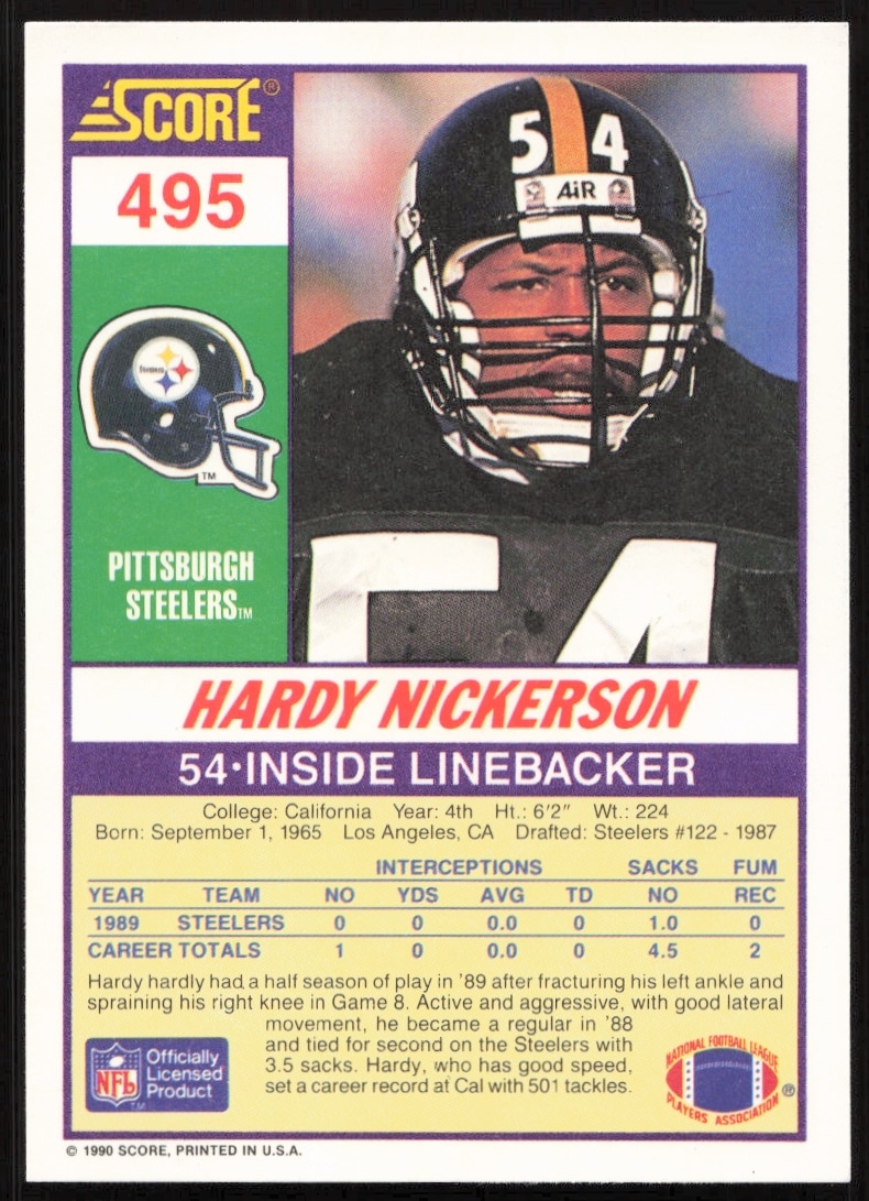 This Football card, from 1990 is part of the Score card set. Hardy Nickerson is featured and has a card number of 495.