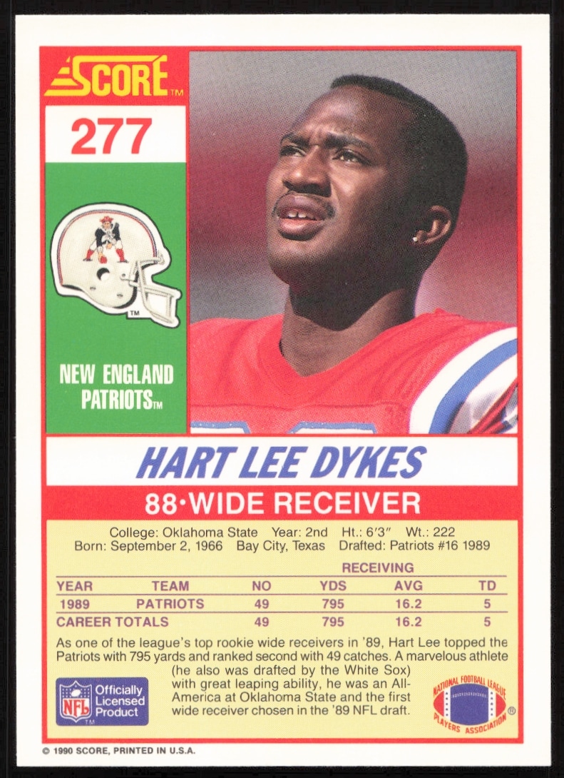 This Football card, from 1990 is part of the Score card set. Hart Lee Dykes is featured and has a card number of 277.
