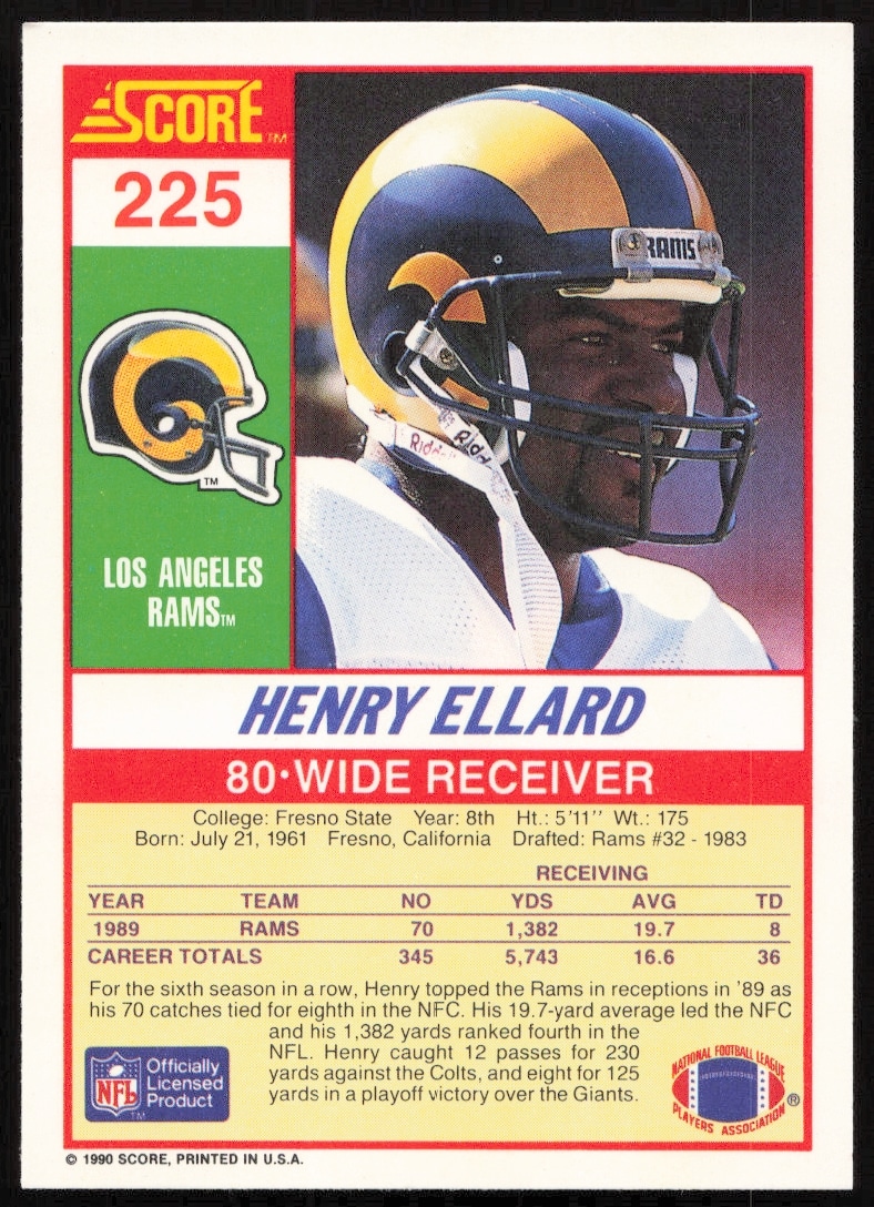 This Football card, from 1990 is part of the Score card set. Henry Ellard is featured and has a card number of 225.