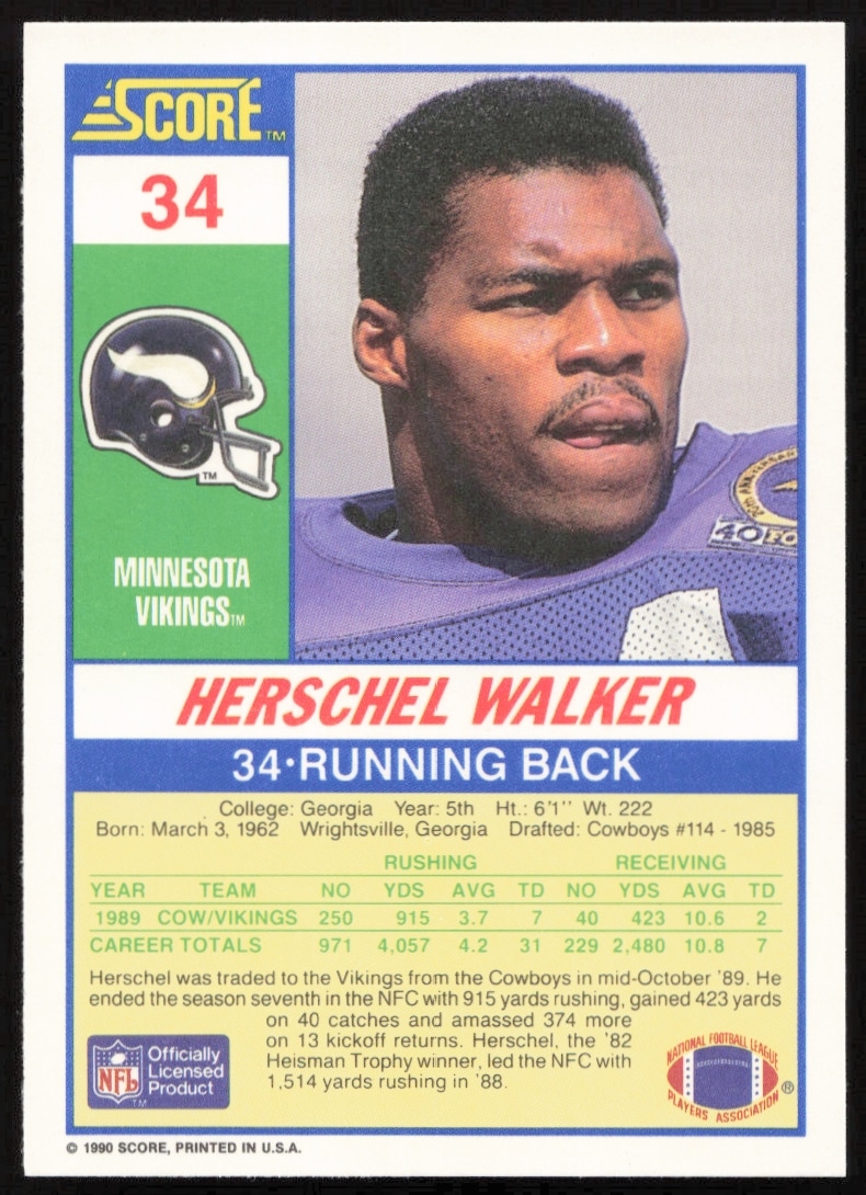 This Football card, from 1990 is part of the Score card set. Herschel Walker is featured and has a card number of 34.