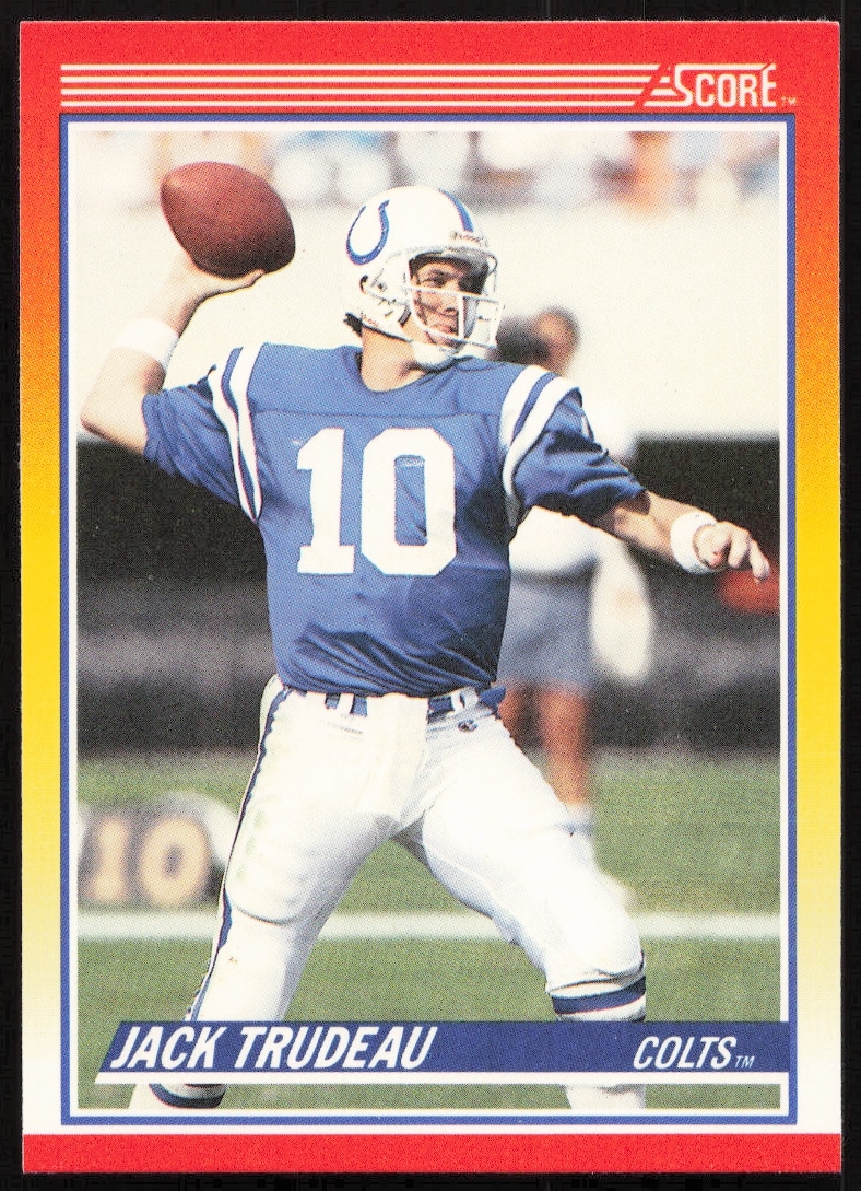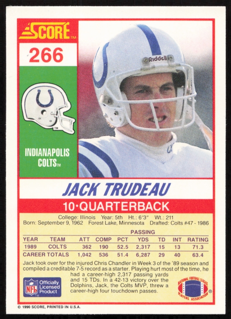 This Football card, from 1990 is part of the Score card set. Jack Trudeau is featured and has a card number of 266.