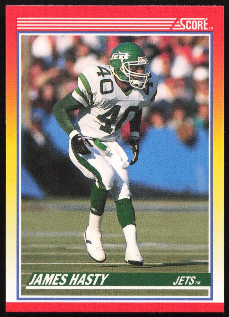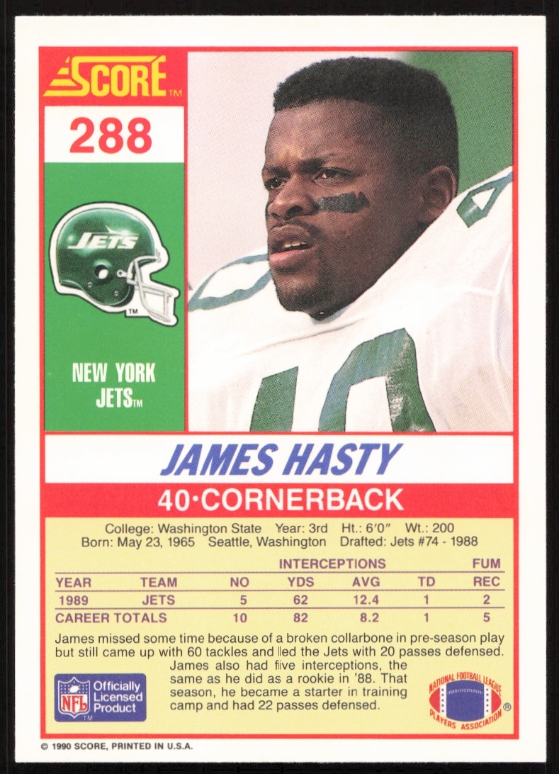 This Football card, from 1990 is part of the Score card set. James Hasty is featured and has a card number of 288.