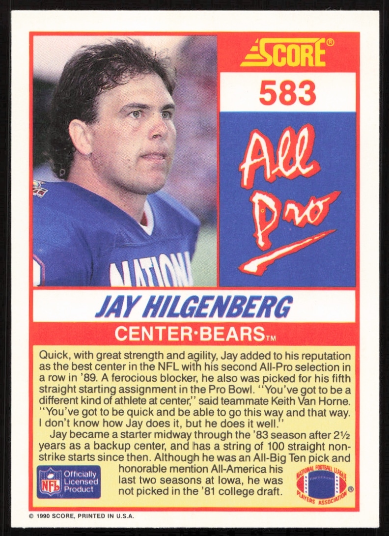 This Football card, from 1990 is part of the Score card set. Jay Hilgenberg is featured and has a card number of 583.