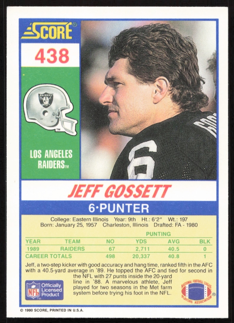 This Football card, from 1990 is part of the Score card set. Jeff Gossett is featured and has a card number of 438.