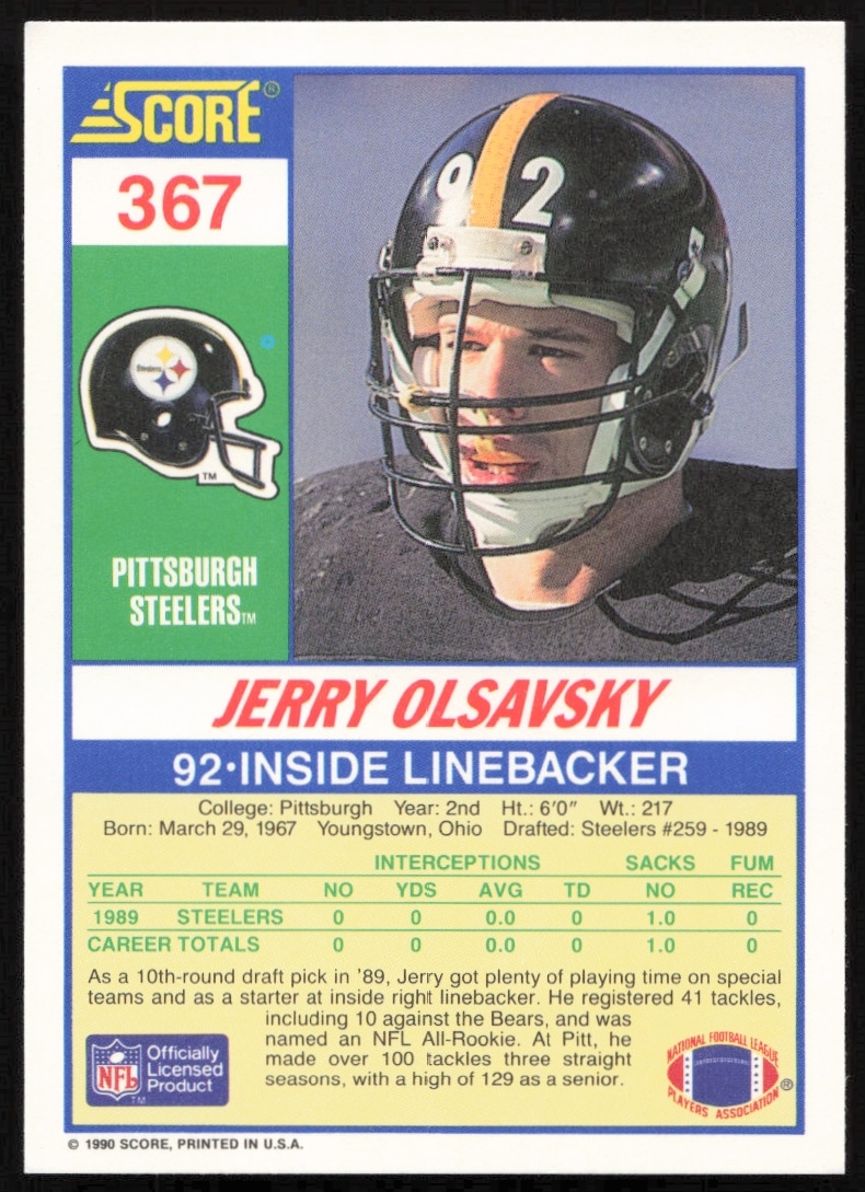 This Football card, from 1990 is part of the Score card set. Jerry Olsavsky is featured and has a card number of 367.