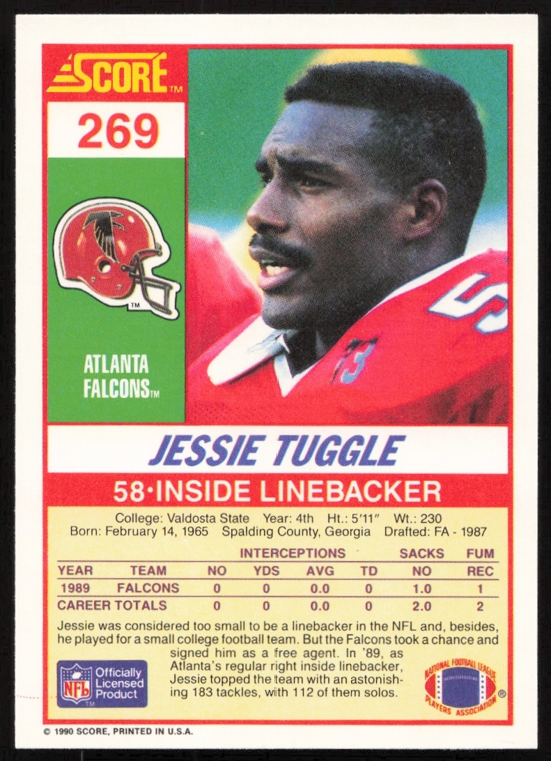 This Football card, from 1990 is part of the Score card set. Jessie Tuggle is featured and has a card number of 269.