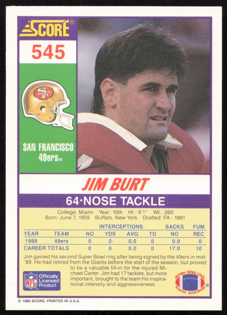 This Football card, from 1990 is part of the Score card set. Jim Burt is featured and has a card number of 545.