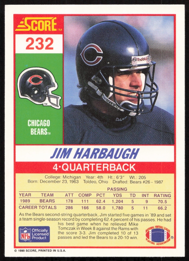 This Football card, from 1990 is part of the Score card set. Jim Harbaugh is featured and has a card number of 232.