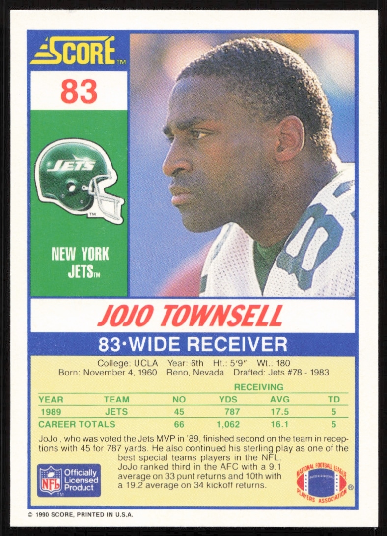 This Football card, from 1990 is part of the Score card set. Jo Jo Townsell is featured and has a card number of 83.
