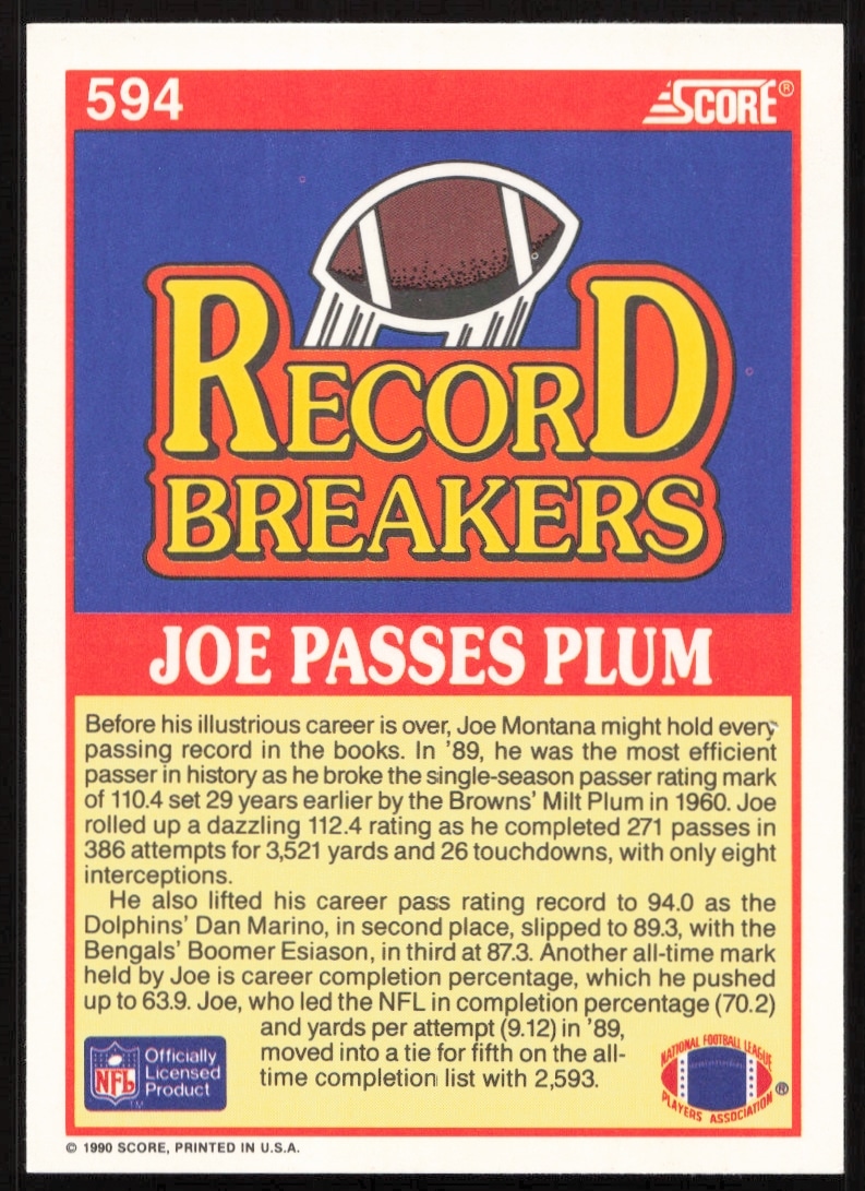 This Football card, from 1990 is part of the Score card set. Joe Montana is featured and has a card number of 594.