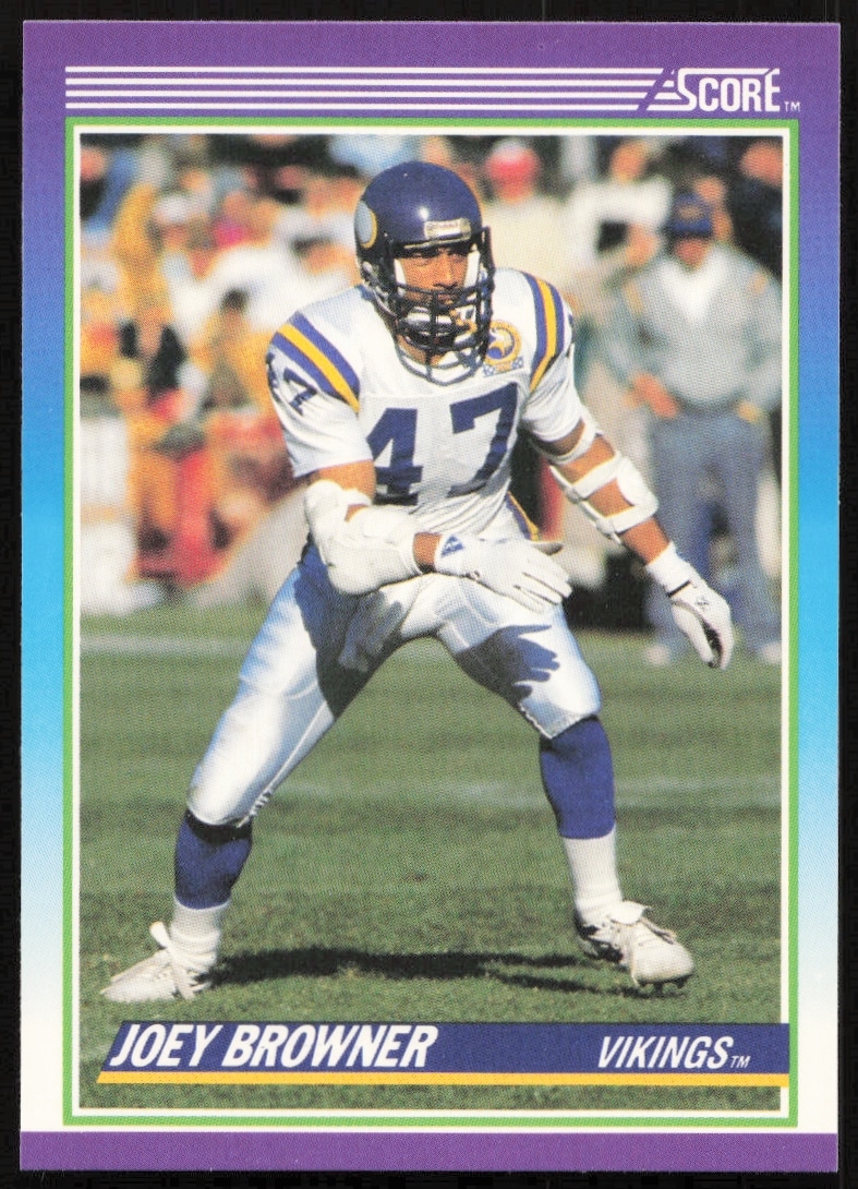 This Football card, from 1990 is part of the Score card set. Joey Browner is featured and has a card number of 147.