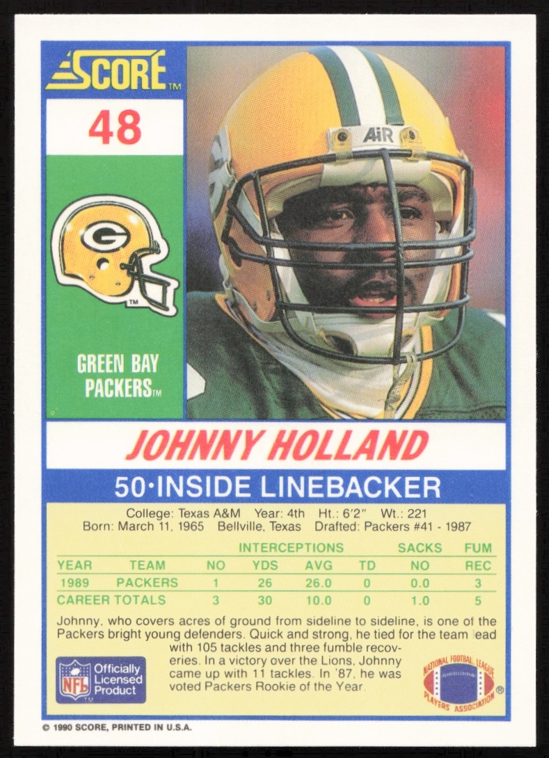 This Football card, from 1990 is part of the Score card set. Johnny Holland is featured and has a card number of 48.