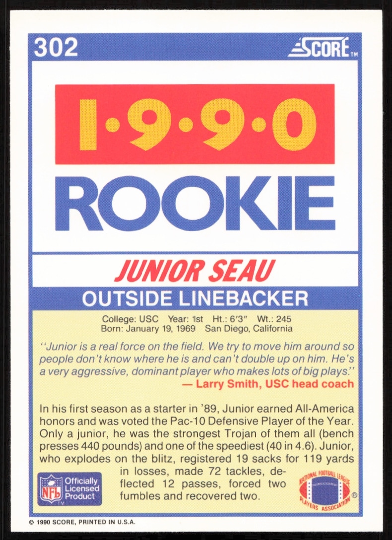 This Football card, from 1990 is part of the Score card set. Junior Seau is featured and has a card number of 302.
