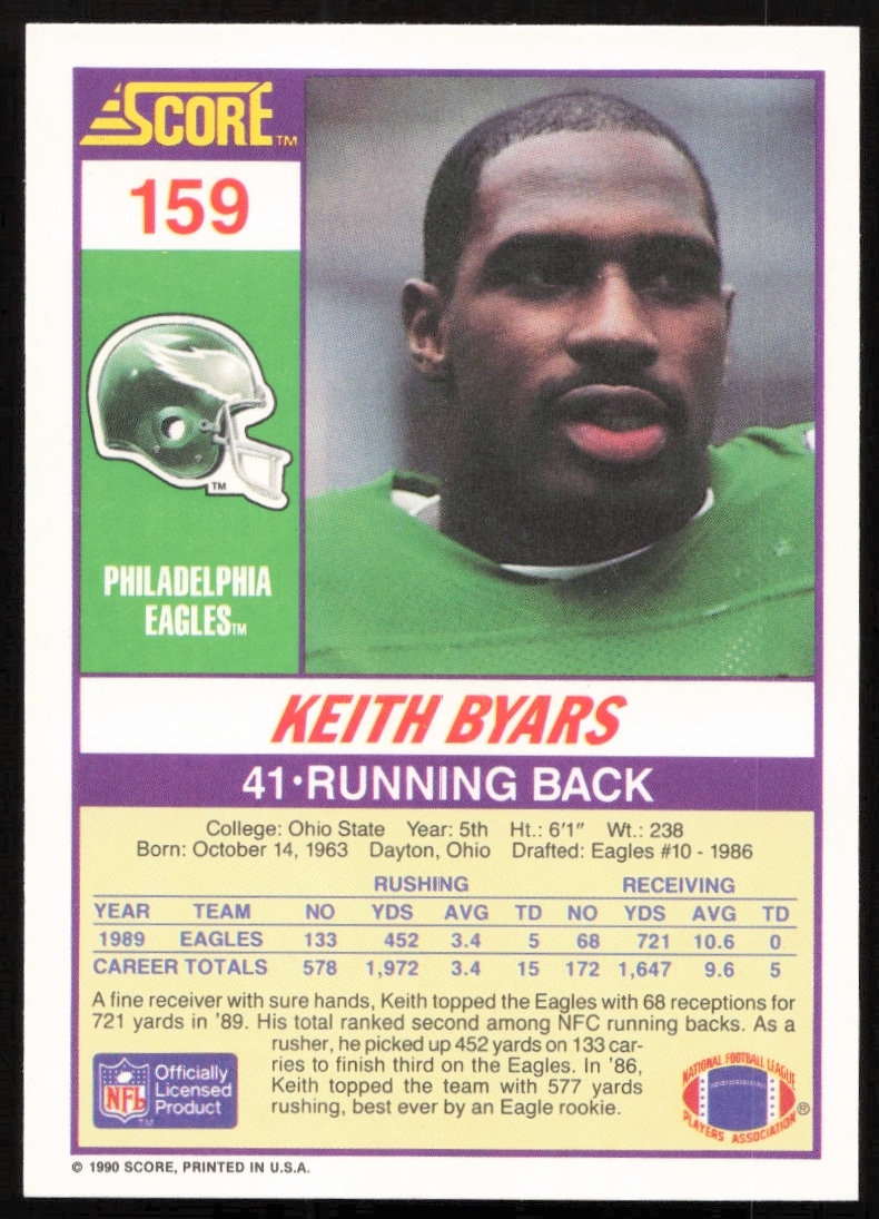 This Football card, from 1990 is part of the Score card set. Keith Byars is featured and has a card number of 159.