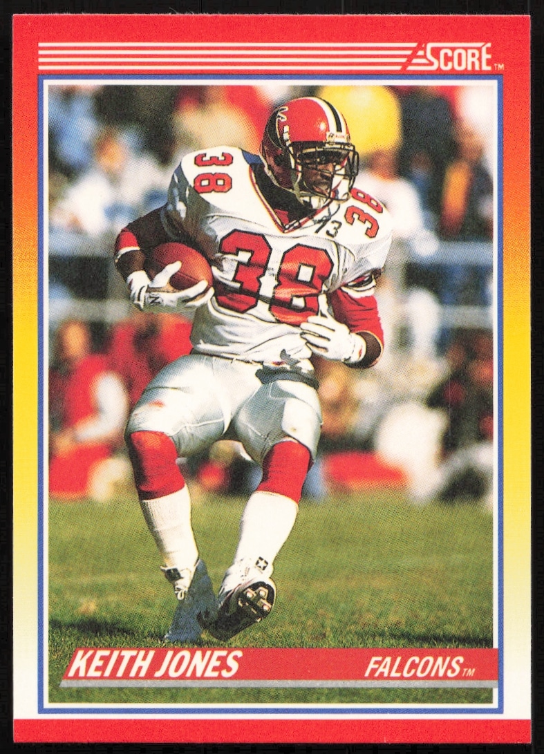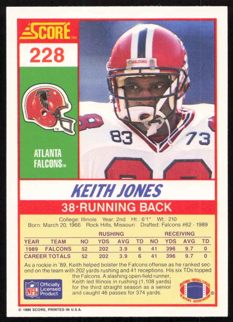 This Football card, from 1990 is part of the Score card set. Keith Jones is featured and has a card number of 228.