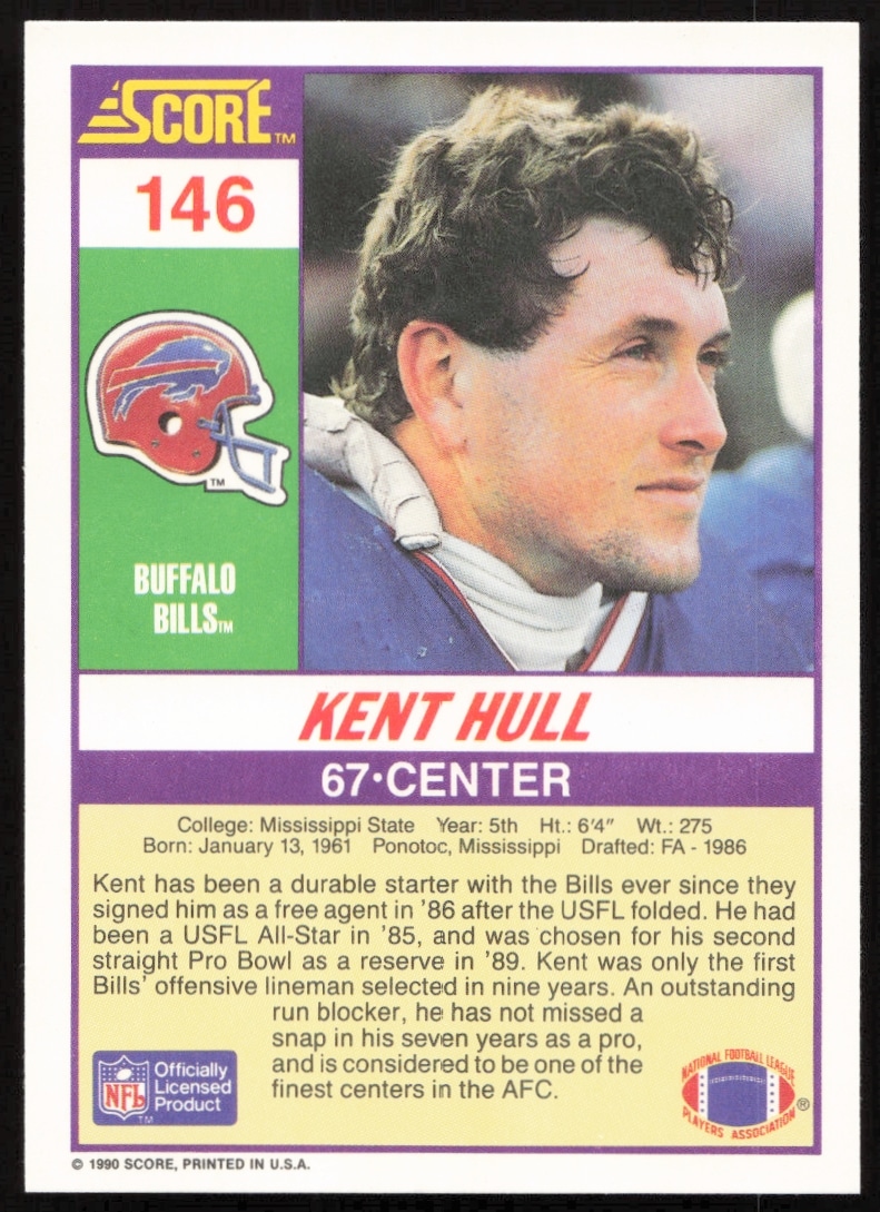 This Football card, from 1990 is part of the Score card set. Kent Hull is featured and has a card number of 146.