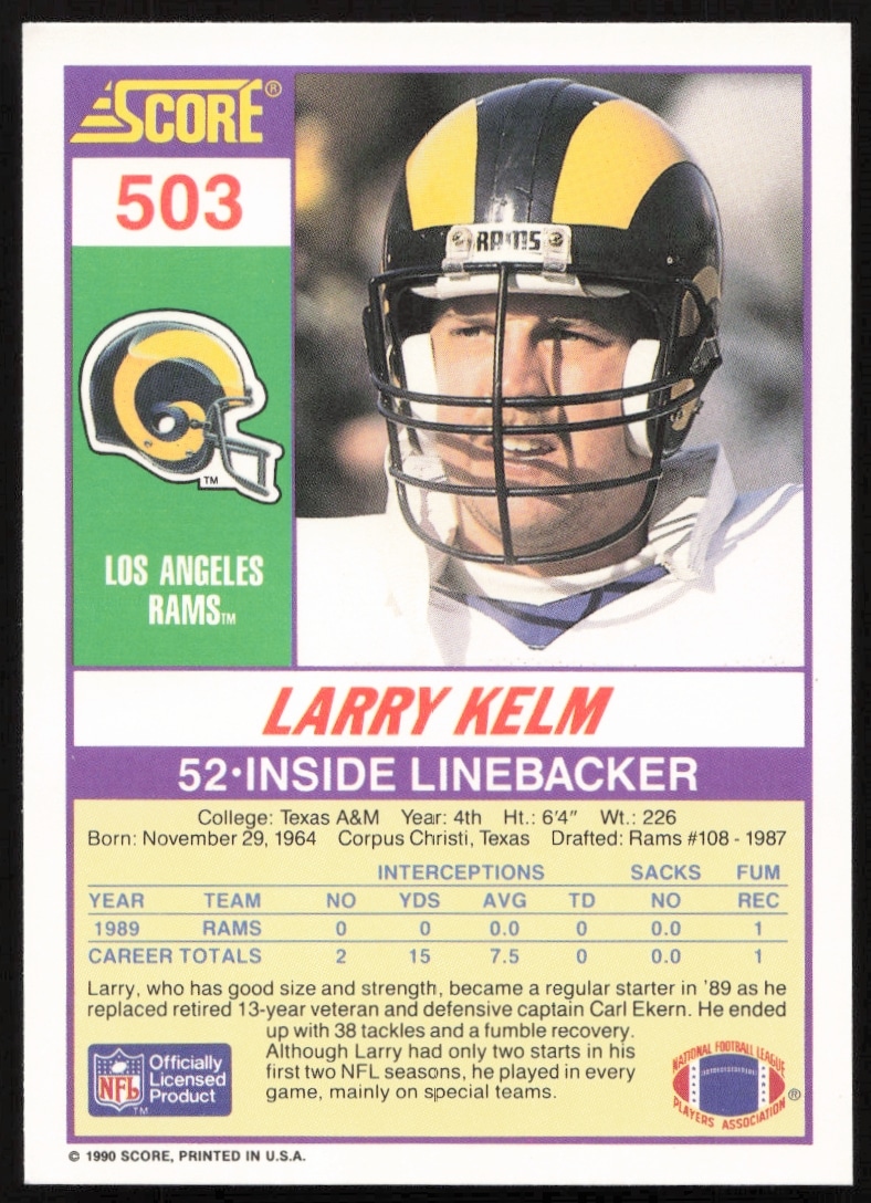 This Football card, from 1990 is part of the Score card set. Larry Kelm is featured and has a card number of 503.