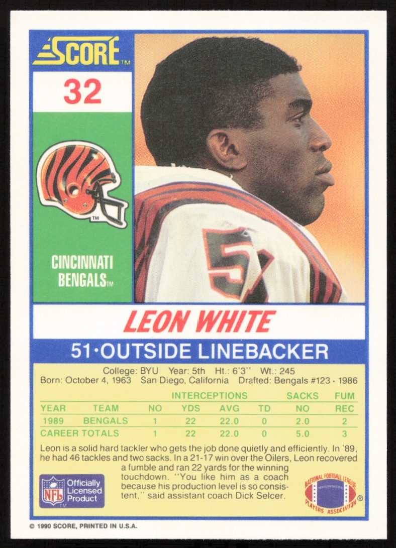 This Football card, from 1990 is part of the Score card set. Leon White is featured and has a card number of 32.