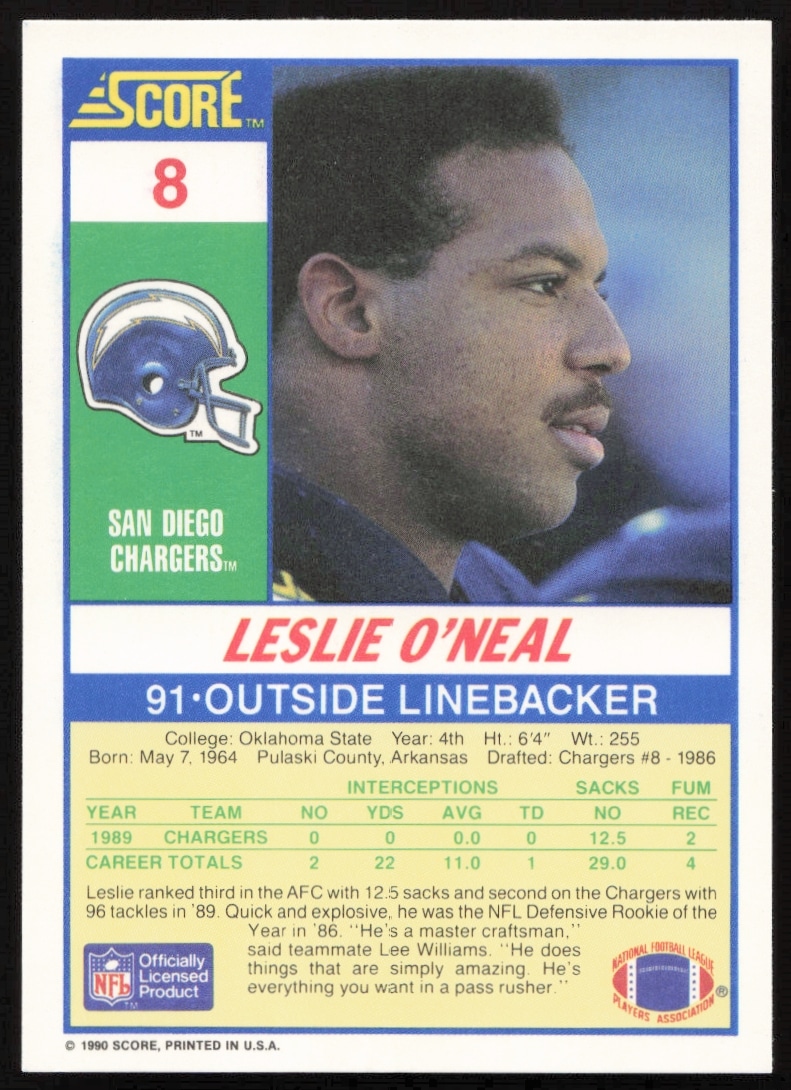 This Football card, from 1990 is part of the Score card set. Leslie O’Neal is featured and has a card number of 8.