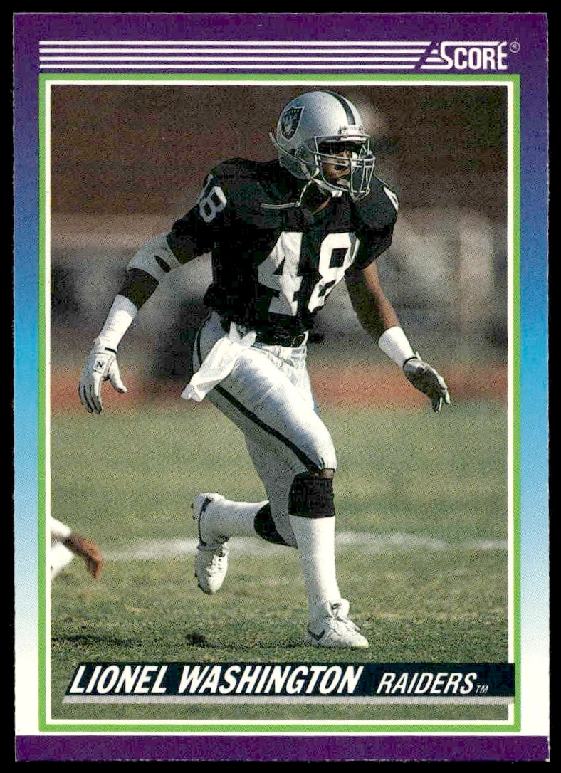 This Football card, from 1990 is part of the Score card set. Lionel Washington is featured and has a card number of 477.