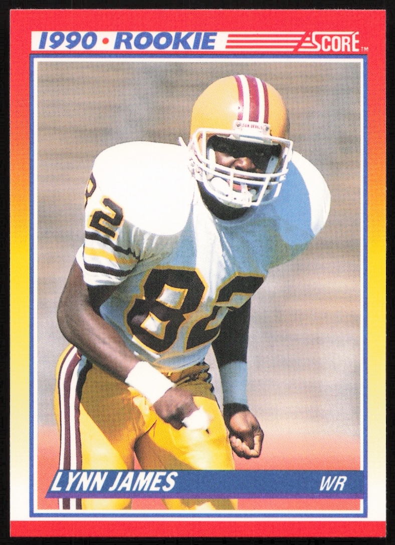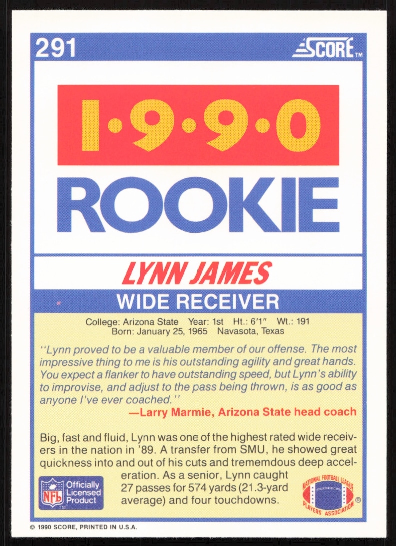 This Football card, from 1990 is part of the Score card set. Lynn James is featured and has a card number of 291.