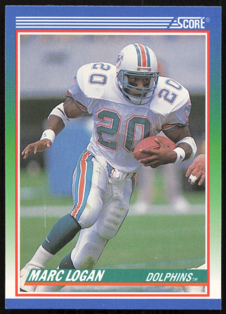 This Football card, from 1990 is part of the Score card set. Marc Logan is featured and has a card number of 336.