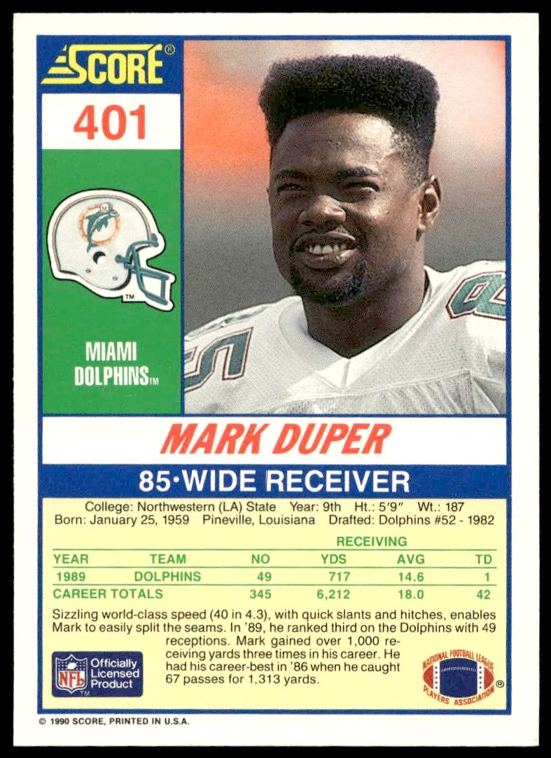 This Football card, from 1990 is part of the Score card set. Mark Duper is featured and has a card number of 401.
