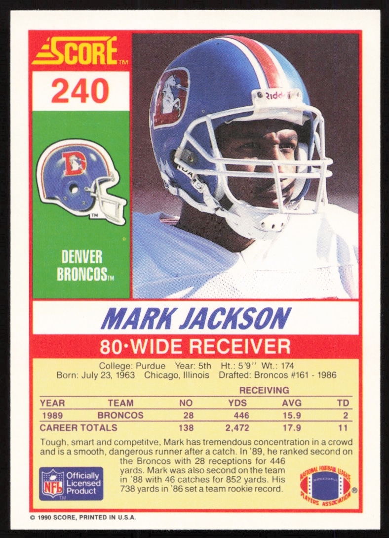 This Football card, from 1990 is part of the Score card set. Mark Jackson is featured and has a card number of 240.