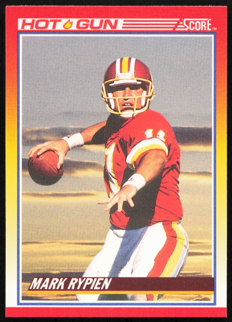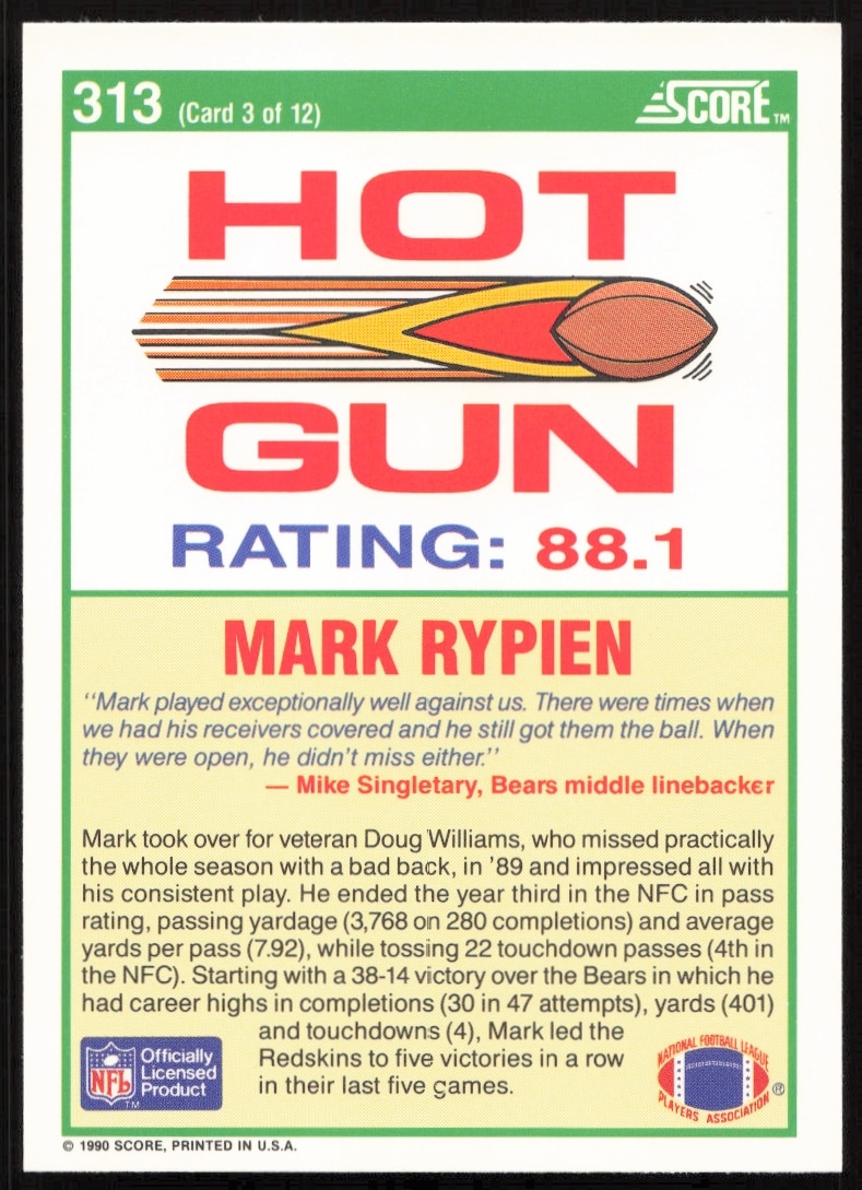 This Football card, from 1990 is part of the Score card set. Mark Rypien is featured and has a card number of 313.