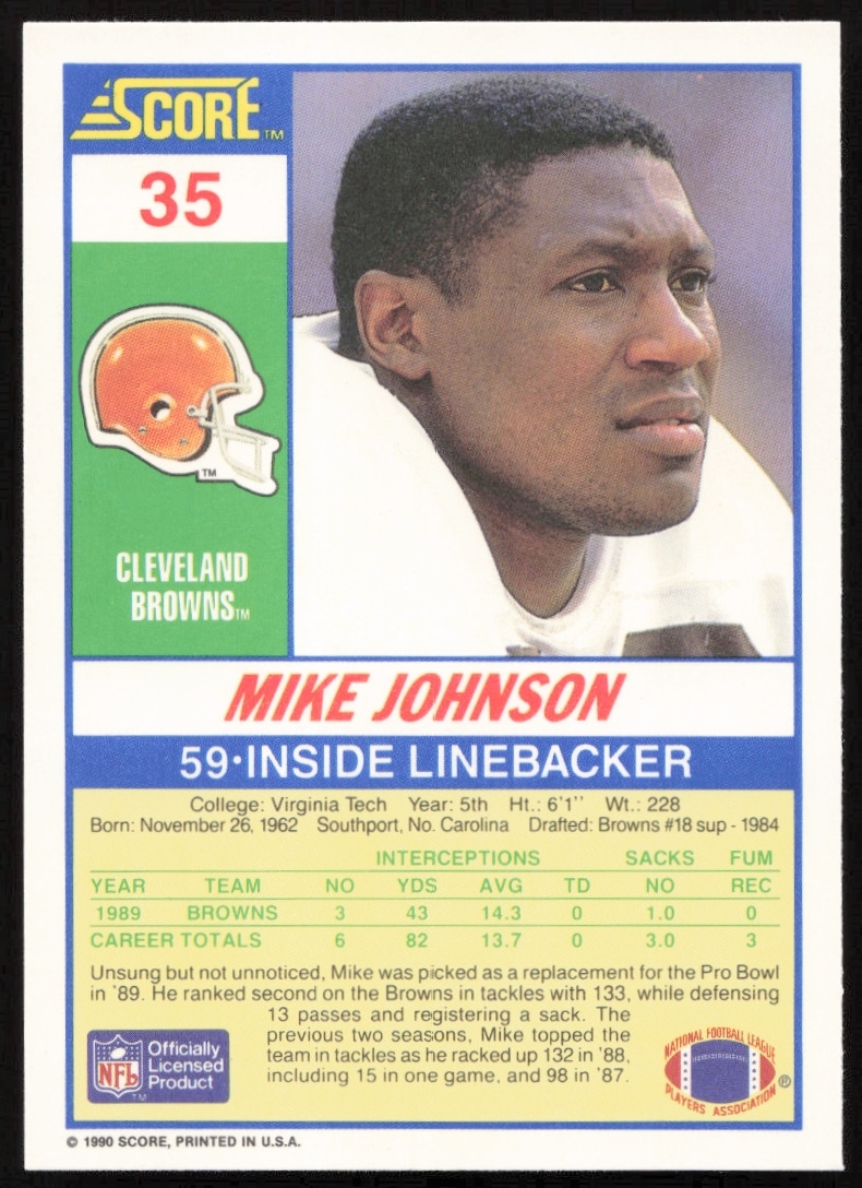 This Football card, from 1990 is part of the Score card set. Mike Johnson is featured and has a card number of 35.