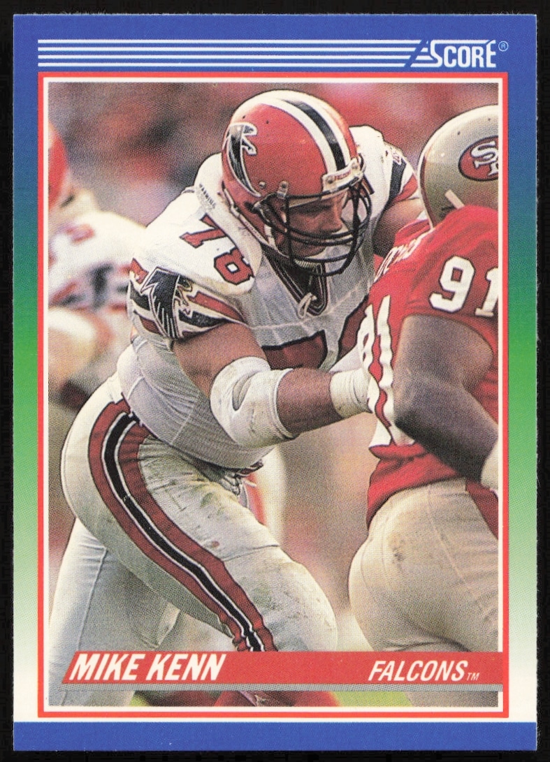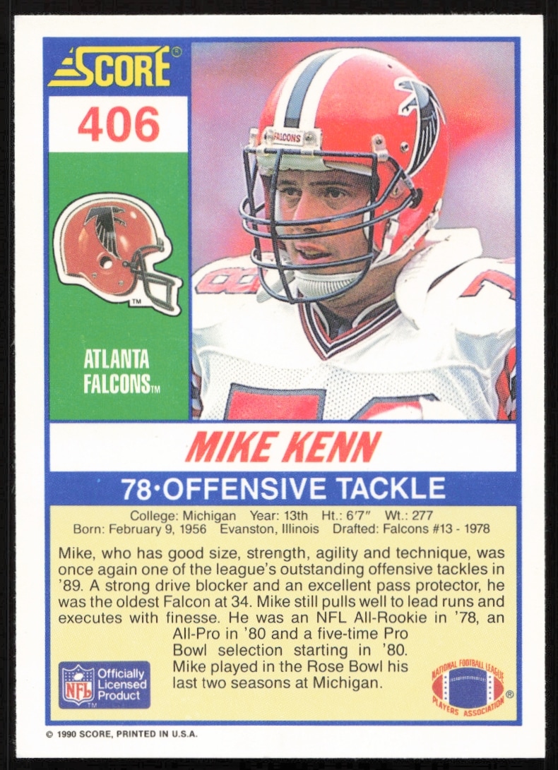 This Football card, from 1990 is part of the Score card set. Mike Kenn is featured and has a card number of 406.