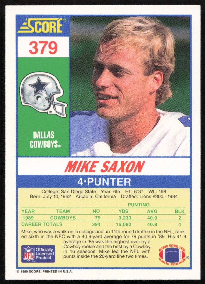 This Football card, from 1990 is part of the Score card set. Mike Saxon is featured and has a card number of 379.