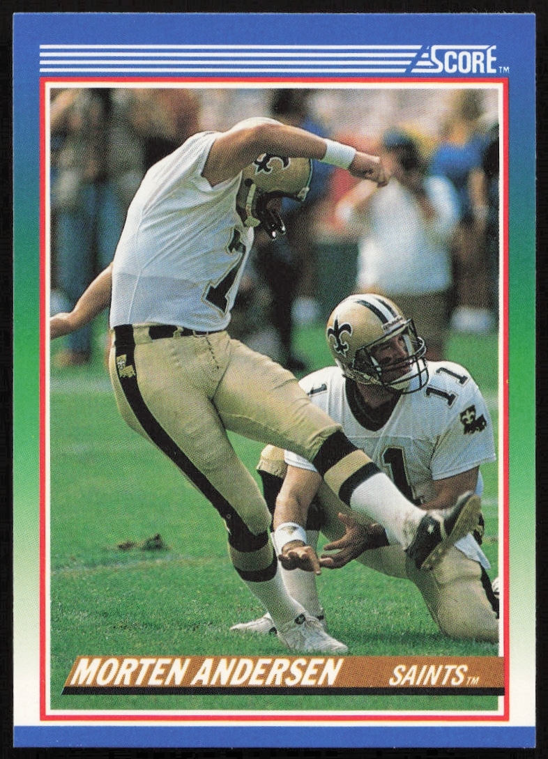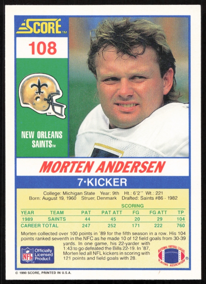 This Football card, from 1990 is part of the Score card set. Morten Andersen is featured and has a card number of 108.