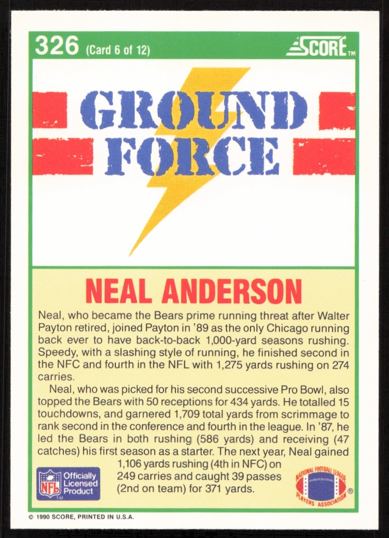 This Football card, from 1990 is part of the Score card set. Neal Anderson is featured and has a card number of 326.
