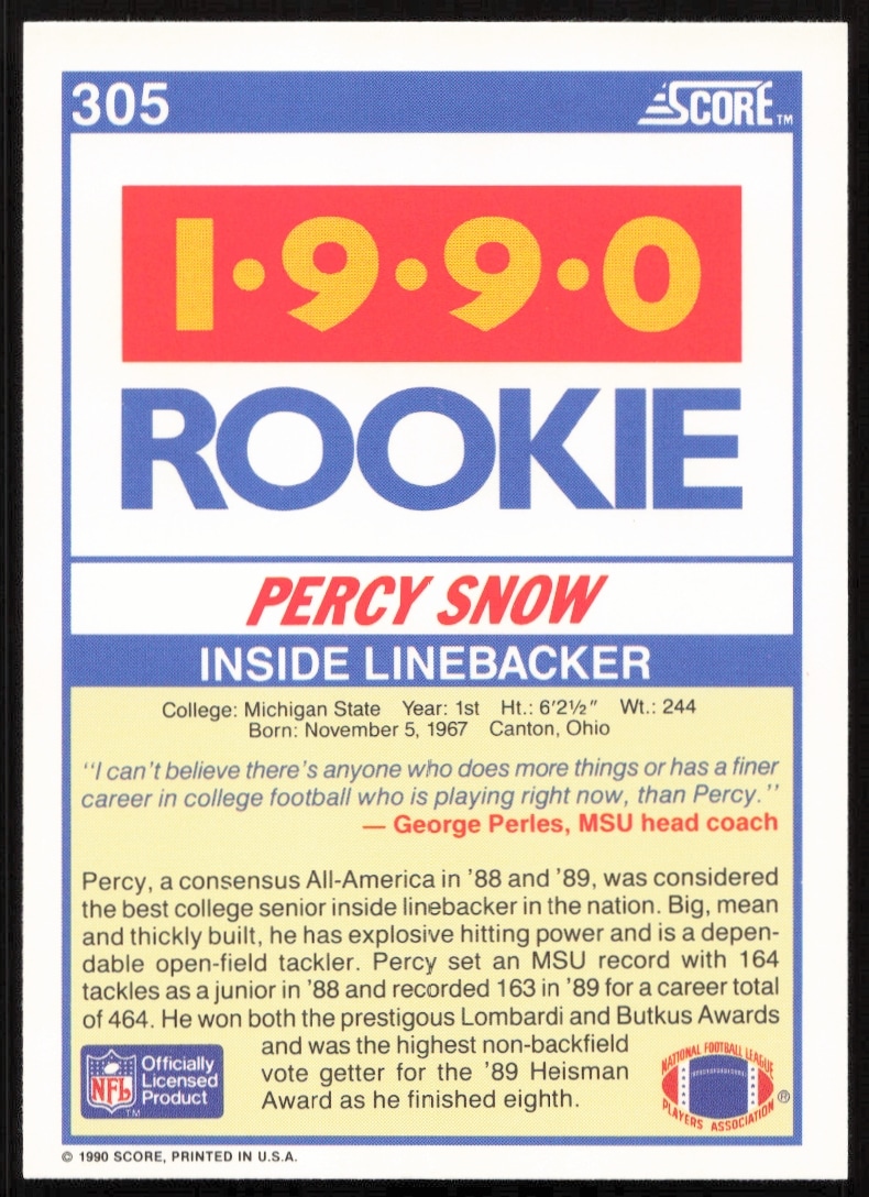 This Football card, from 1990 is part of the Score card set. Percy Snow is featured and has a card number of 305.
