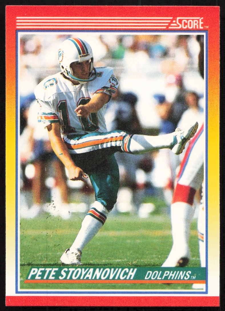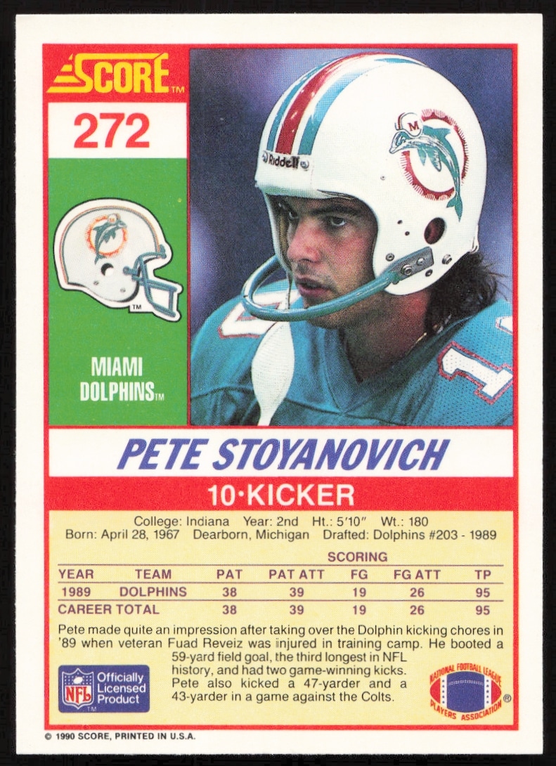 This Football card, from 1990 is part of the Score card set. Pete Stoyanovich is featured and has a card number of 272.