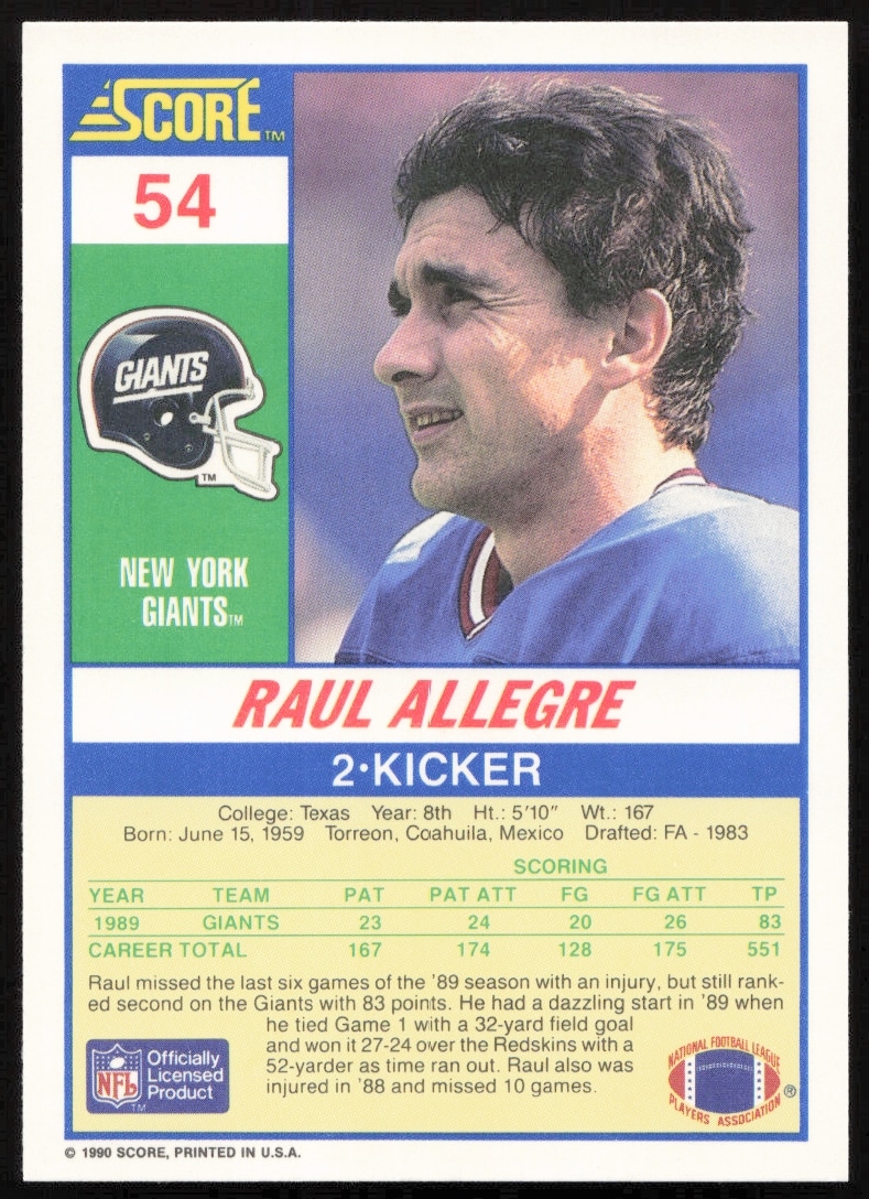 This Football card, from 1990 is part of the Score card set. Raul Allegre is featured and has a card number of 54.