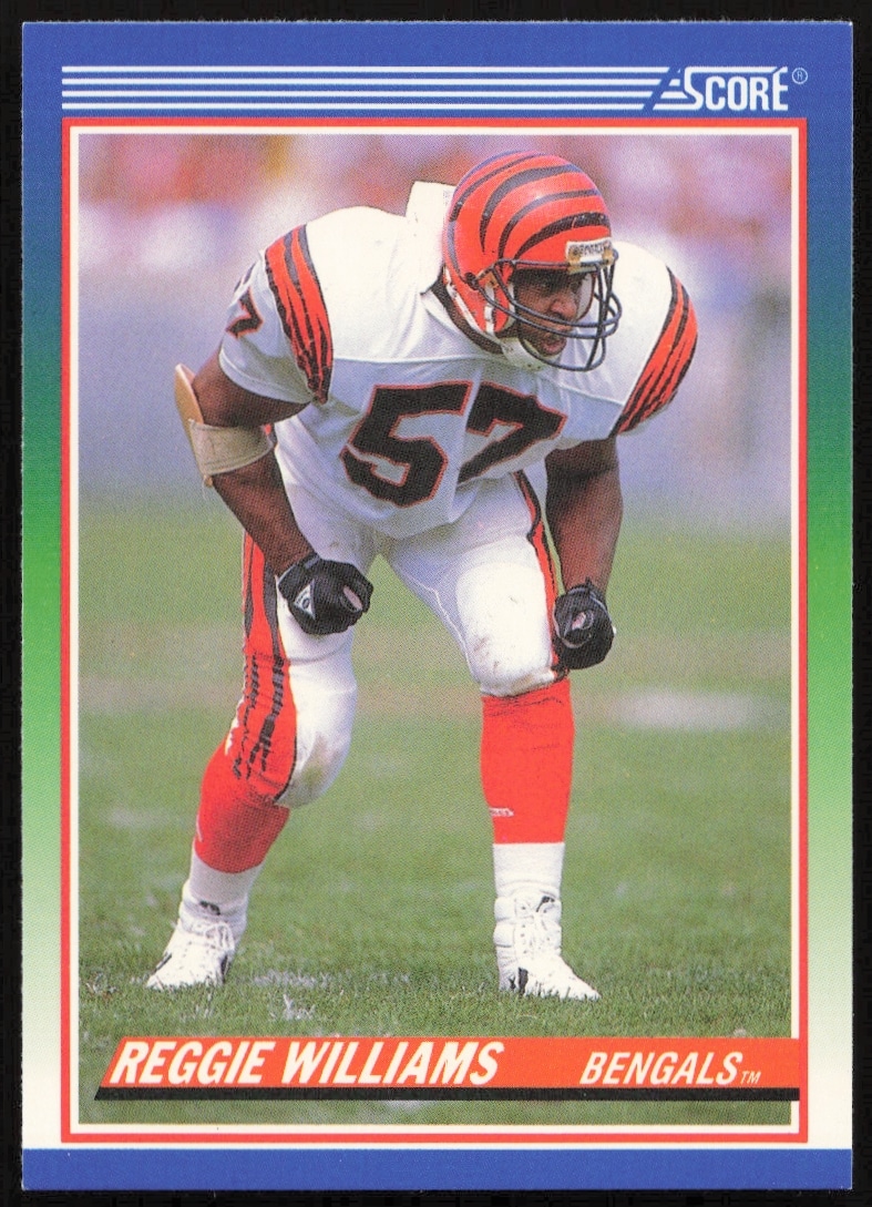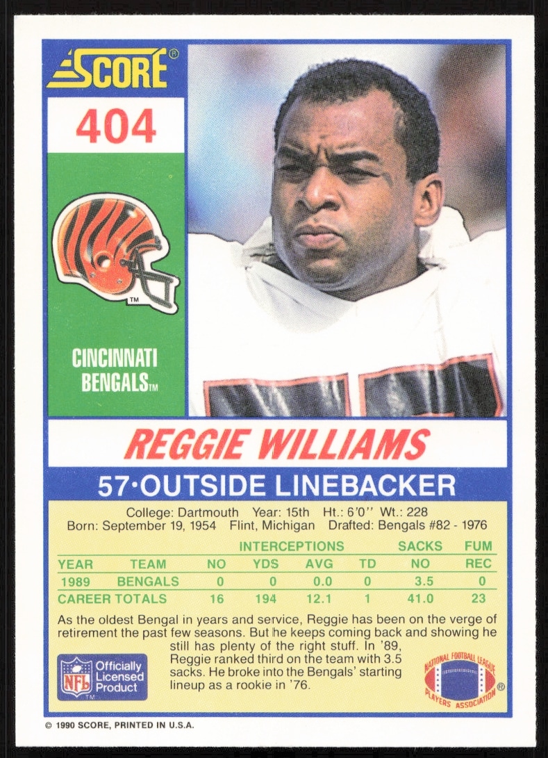 This Football card, from 1990 is part of the Score card set. Reggie Williams is featured and has a card number of 404.