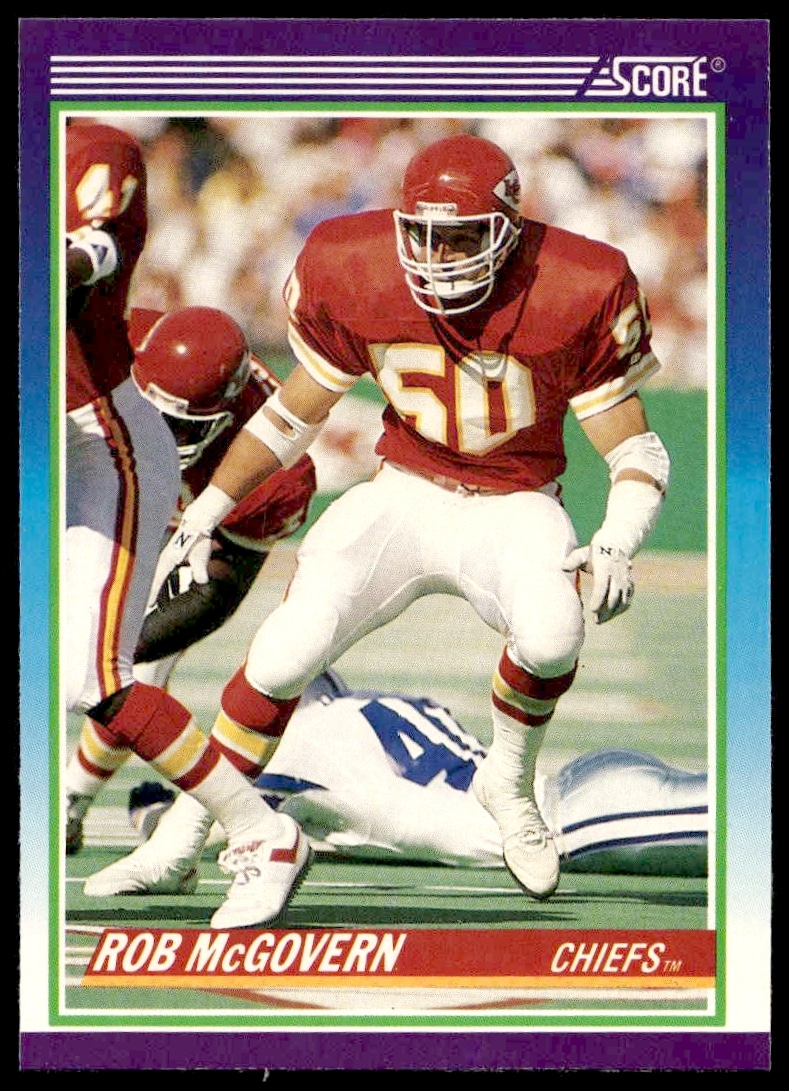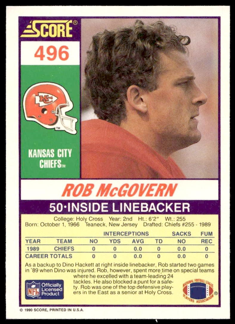 This Football card, from 1990 is part of the Score card set. Rob McGovern is featured and has a card number of 496.