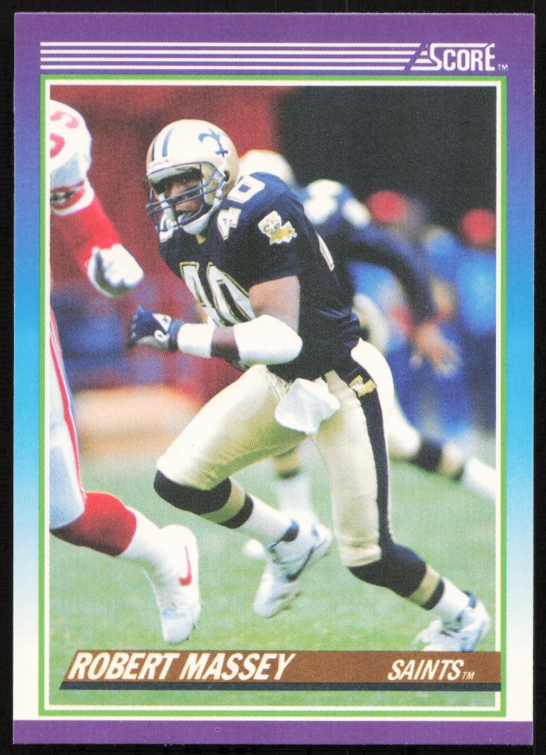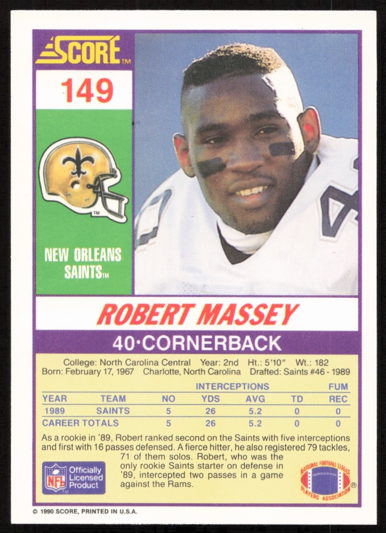 This Football card, from 1990 is part of the Score card set. Robert Massey is featured and has a card number of 149.